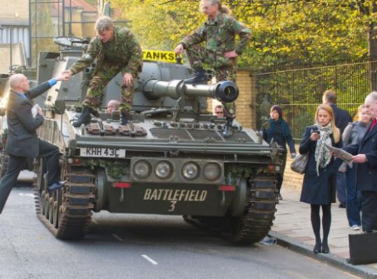 Στην Αγγλία όμως, είναι για καλό. Το Battlefield 3 κυκλοφόρησε, η μάχη που δίνει με το καινούριο Μodern Warfare είναι τεράστια και η ΕΑ σκέφτηκε: «Τι καλύτερη διαφήμιση από το να βγάλω ένα τανκ στους δρόμους».