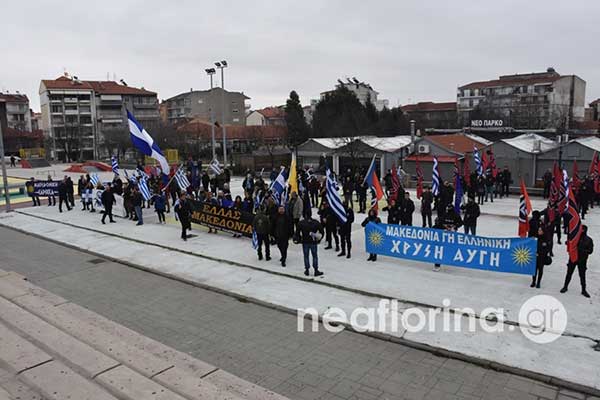 Την ίδια ώρα, οι οργανώσεις «Χρυσή Αυγή», «Ιερός Λόχος 2012», «Έλληνες: Η Ελλάδα υπεράνω όλων» και «Μακεδονική Σάρισα» συγκεντρώθηκαν στο νέο πάρκο Φλώρινας για να διαδηλώσουν με συνθήματα και σύντομες ομιλίες, υπό το άγρυπνο βλέμμα της αστυνομίας. Στους χρυσαυγίτες δεν επετράπη να μεταβούν στην κεντρική πλατεία Γ. Μόδη για να μην δημιουργηθούν επεισόδια και συμπλοκές με οργανώσεις της Φλώρινας. Δρακόντεια τα αστυνομικά μέτρα ασφαλείας δεν επέτρεψαν να δημιουργηθεί το παραμικρό.