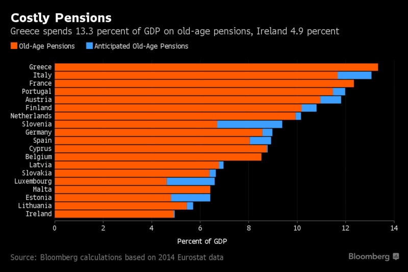 Επικαλούμενο στοιχεία της Eurostat του 2014, που βάσει αυτών, η Ελλάδα δαπανά το 13,3% για τις συντάξεις ηλικιωμένων, ποσοστό που αποτελεί το υψηλότερο στην ευρωπαϊκή ζώνη, δημοσίευμα του Bloomberg, σχολιάζει ότι το ζήτημα των περικοπών στις συντάξεις έχει αποτελέσει μεγάλο σημείο τριβής ανάμεσα στην ελληνική κυβέρνηση και τους δανειστές.