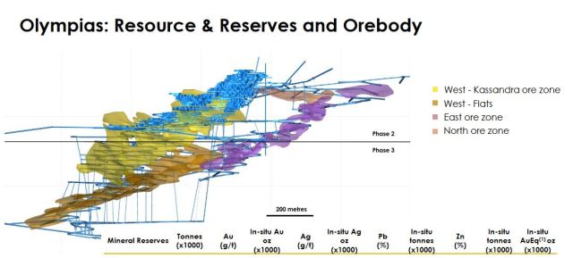 Στην Ολυμπιάδα υπάρχουν δύο μεταλλοφόρα σώματα πολύ κοντά μεταξύ τους, το Ανατολικό και το Δυτικό. Το ανατολικό κοίτασμα είναι πιο πλούσιο σε χρυσό, αλλά και πιο πλούσιο σε αρσενικό (ο χρυσός συγκεντρώνεται κατά προτίμηση στον αρσενοπυρίτη, δηλαδή η ανατολική ζώνη έχει και το πιο υψηλό αρσενικό). Η Α.Ε.Ε.Χ.Π.&Λ κατά το παρελθόν είχε εκμεταλλευτεί κυρίως το δυτικό κοίτασμα. Η νέα εκμετάλλευση από την Ελληνικός Χρυσός αφορά στην ολοκλήρωση της εξόρυξης στις περιοχές αυτές, την επέκταση στους βαθύτερους ορίζοντες του δυτικού κοιτάσματος, αλλά κυρίως στην εξόρυξη του πλήρως ερευνημένου ανατολικού κοιτάσματος.