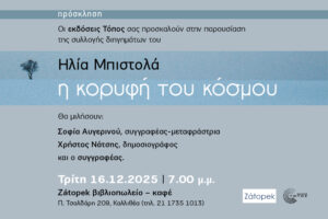 Οι εκδόσεις Τόπος μας προσκαλούν στην παρουσίαση της συλλογής διηγημάτων του Ηλία Μπιστολά «Η κορυφή του κόσμου», την Τρίτη, 16/12, στις 7 μ.μ. στο Zatopek.