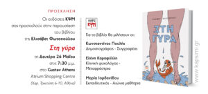 Οι εκδόσεις ΚΨΜ προσκαλούν στην παρουσίαση του βιβλίου της Ελισάβετ Φωτοπούλου «Στη γύρα», τη Δευτέρα 26 Μαΐου στις 7:30 μ.μ., στο Gustav Athens – Atrium Shopping Centre (Χαρ. Τρικούπη 6-10,…