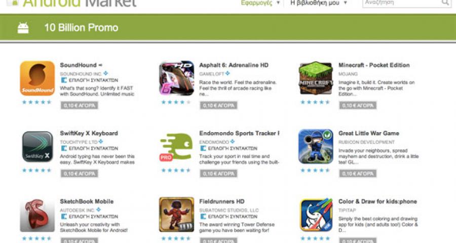 Android Market | Γιορτάζει 10 δις downloads με προσφορές!Σαμπάνιες ανοίγουν στην Google με τις επιδόσεις του Android Market, το οποίο πηγαίνει απ’ το καλό στο καλύτερο. Πλέον έφτασε τα 10 δισεκατομμύρια downloads, με την Google να μειώνει κατά 90% την τιμή των δημοφιλέστερων εφαρμογών της. Όσοι είχατε «βάλει στο μάτι» κάποια και δεν την είχατε αγοράσει ακόμα, τώρα είναι η ευκαιρία, μιας και πωλούνται €0,10 η κάθε μια.