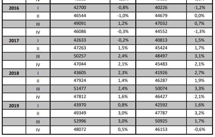 Το αποτέλεσμα αυτό του τελευταίου τριμήνου του 2019 έρχεται σε συνέχεια της μείωσης του ΑΕΠ κατά 0,7% το δ’ τρίμηνο πέρυσι, σε σύγκριση με το γ’ τρίμηνο 2019 και της αύξησης κατά 1% το δ’ τρίμηνο 2019, σε σχέση με το δ’ τρίμηνο 2018. Έτσι, συγκρίνοντας το τρίτο με το τέταρτο τρίμηνο του 2019, και με δεδομένη τη μείωση του ΑΕΠ κατά 0,7%, καταγράφηκαν τα ακόλουθα: