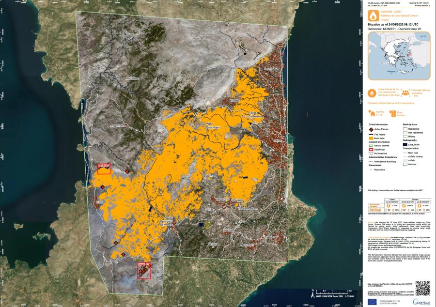 Η Περιφέρεια Βορείου Αιγαίου εκτιμά ότι έχουν καεί πάνω από 60.000 στρέμματα δασών και καλλιεργειών έχουν γίνει στάχτη, ενώ η πλήρης αποτίμηση της ζημιάς θα πραγματοποιηθεί όταν τεθεί υπό έλεγχο και η τελευταία εστία φωτιάς. Ενδεικτικά, σύμφωνα με τον δορυφορικό χάρτη του Copernicus, μέχρι το μεσημέρι της Τρίτης (24/6) είχαν καεί 40.918 στρέμματα.