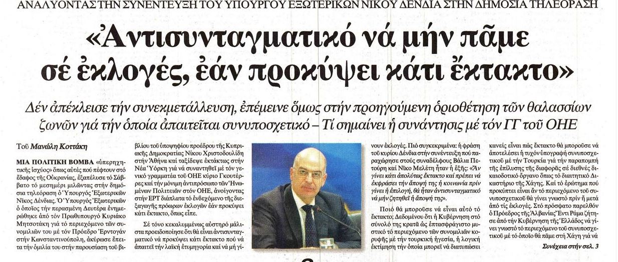 Η δήλωση Δένδια έγινε πρωτοσέλιδο της Δευτέρα στην εφημερίδα «Εστία», με άρθρο του διευθυντή της, Μανώλη Κοττάκη, που συνδέει την προειδοποίησή του με τις επαφές στα ελληνοτουρκικά, το σενάριο της συνεκμετάλλευσης και του συνυποσχετικού για το δικαστήριο της Χάγης.