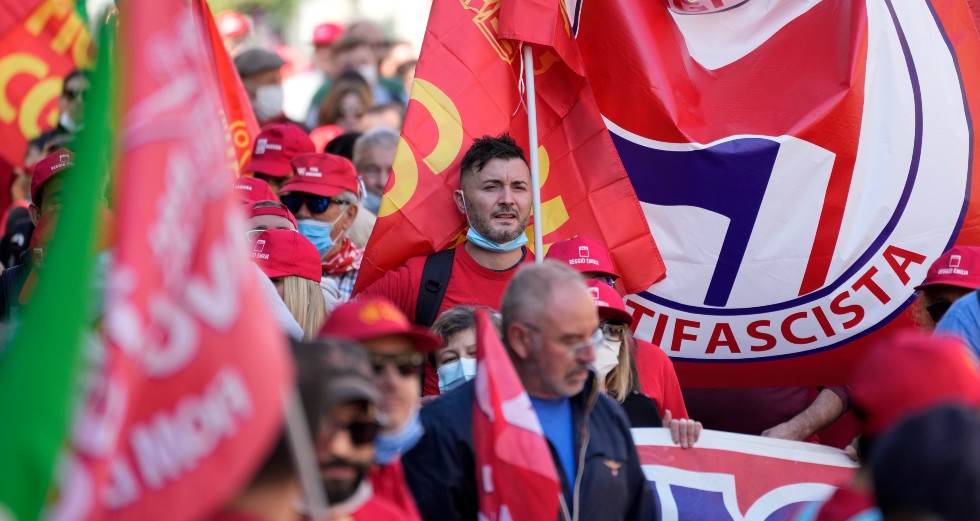 Trade unions hold anti-fascist protest after attack on union HQ in Rome : Trade unions hold an anti-fascist protest in Rome, after violent protests last week in the centre of the city against the extension of the government’s coronavirus pass led to a storming of the CGIL trade pic.twitter.com/SgSCx9IEWS