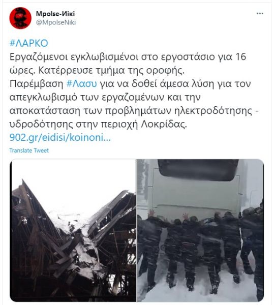 Από το βράδυ της Κυριακής έως το μεσημέρι της Δευτέρας, δεκάδες εργαζόμενοι στο εργοστάσιο της ΛΑΡΚΟ στη Λάρυμνα εγκλωβίστηκαν μετά από κατάρρευση μεγάλου τμήματος της οροφής του εργοστασίου. Έμειναν επί 16 ώρες χωρίς τροφή, κάτω από αντίξοες καιρικές συνθήκες.
