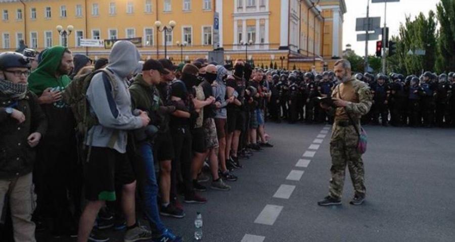 Το πρωί της Κυριακής περίπου 150 ακροδεξιοί διαδηλωτές προσπάθησαν να αποκλείσουν το δρόμο στον οποίο θα πραγματοποιούνταν η παρέλαση στο κέντρο της ουκρανικής πρωτεύουσας. Συγκρούσεις περιορισμένης έκτασης ξέσπασαν όταν οι αστυνομικοί επιχείρησαν να ανοίξουν το δρόμο και προχώρησαν σε συλλήψεις.