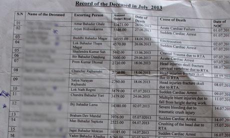 «Πολλοί εργάτες δεν έχουν γεύματα ή αρκετό νερό, όταν δουλεύουν σε υψηλές θερμοκρασίες όλη μέρα. Ο καιρός εδώ είναι διαφορετικός από εκείνον στη χώρα μας. Οι υπήκοοί μας δεν τον έχουν συνηθίσει…Υπάρχουν υποθέσεις που υποψιαζόμαστε ότι υπήρξε κοινή συνεννόηση μεταξύ γιατρών και εταιρείας και ο γιατρός συνέθεσε ψευδές ανακοινωθέν, λέγοντας ότι το θύμα πέθανε από καρδιακή ανακοπή. Είναι ευκολότερο για την εταιρεία να λέει ότι πέθανε από αυτό».