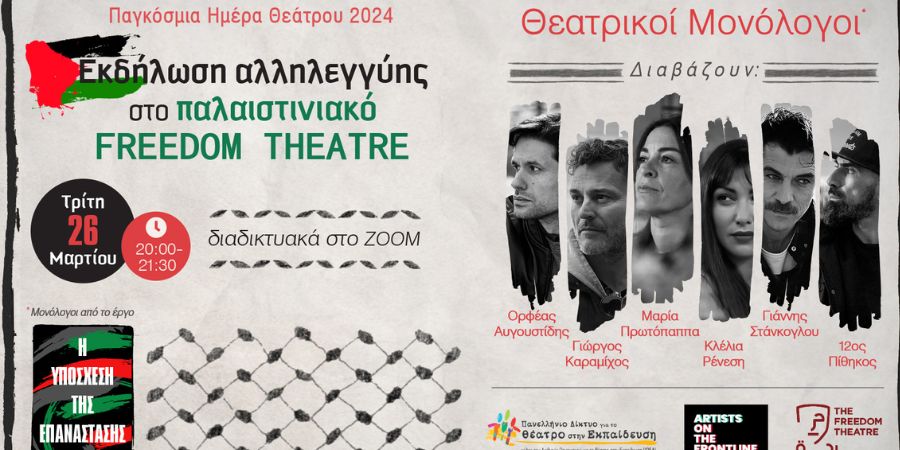 Το Πανελλήνιο Δίκτυο για το Θέατρο στην Εκπαίδευση (ΠΔΘΕ) μετέχει στη διεθνή καμπάνια The Revolution’s Promise από τον Δεκέμβριο του 2023, όταν οι ισραηλινές δυνάμεις κατοχής επιτέθηκαν για πολλοστή φορά στο Freedom Theatre στη Δ. Όχθη της κατεχόμενης Παλαιστίνης, διέπραξαν βανδαλισμούς και συνέλαβαν στελέχη του. Το ΠΔΘΕ με ανοιχτή επιστολή συγκεντρώνει υπογραφές για την απελευθέρωση των κρατουμένων Παλαιστινίων καλλιτεχνών του Freedom Theatre. Για να υπογράψετε πατήστε εδώ.
