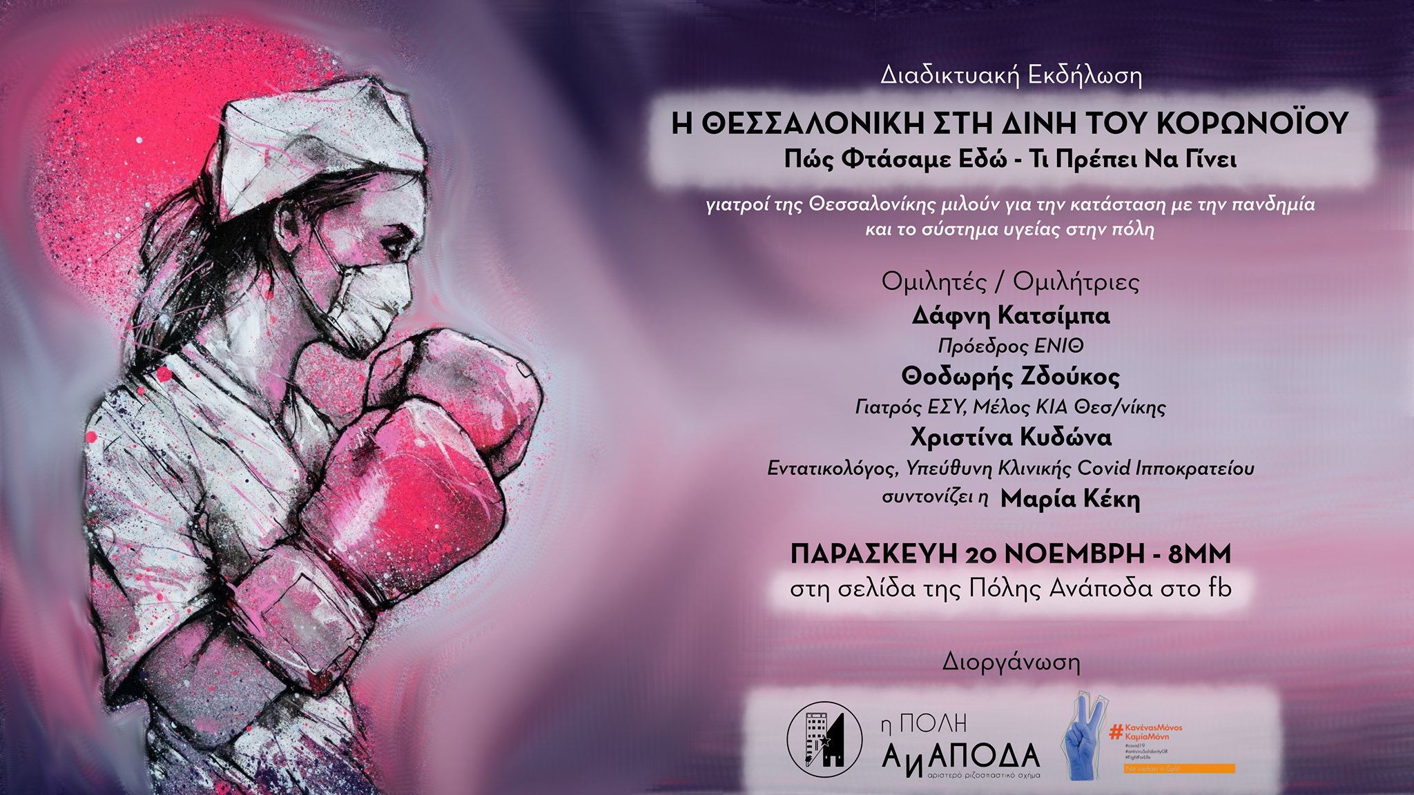 Ενημερωνόμαστε από γιατρούς της πόλης για την πανδημία της COVID 19 στη Θεσσαλονίκη, την κατάσταση του δημόσιου συστήματος υγείας και συζητάμε για την άμεση απάντηση που πρέπει να δώσουμε αλλά και τις νέες μορφές αλληλεγγύης που πρέπει να συγκροτήσουμε.