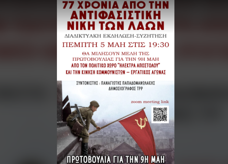 Στην εκδήλωση θα μιλήσουν μέλη της Πρωτοβουλίας για την 9η Μάη από τον Πολιτικό Χώρο Ηλέκτρα Αποστόλου και την Κίνηση Κομμουνιστών – Εργατικός Αγώνας, μέσω της πλατφόρμας Zoom στον παρακάτω σύνδεσμο.