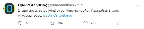 Σε ανάρτησή του στο Twitter, ο Νίκος Μπογιόπουλος κατονομάζει ευθέως την Ομάδα Αλήθειας της ΝΔ, ότι βρίσκεται πίσω από τη διαδικτυακή επίθεση που δέχεται, αφού ο λογαριασμός αυτός έγραψε σε σχετική ανάρτηση: «Σταματήστε το bullying στον Μπογιόπουλο. Υποκριθείτε τους ανιστόρητους», καλώντας έμμεσα σε «νέο γύρο» επιθέσεων.