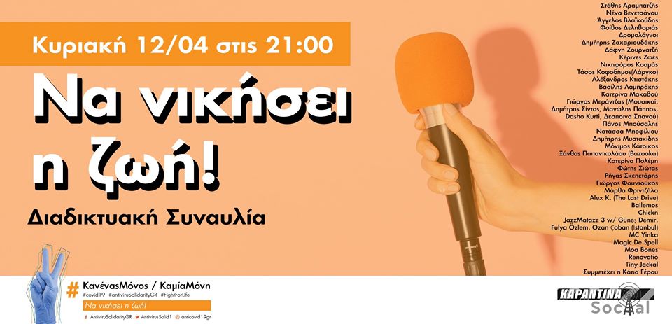 «Κυριακή βράδυ δυναμώνουμε την ένταση στα σαλόνια και στα μπαλκόνια και ακούμε μουσικάρες. Για να ξορκίσουμε τον φόβο. Για να νιώσουμε πιο δυνατοί και δυνατές»