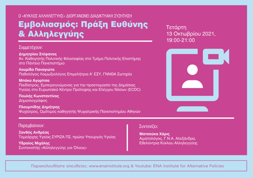 Η συζήτηση θα γίνει διαδικτυακά την Τετάρτη 13 Οκτωβρίου, 19:00 – 21:00 και θα συμμετέχουν οι Δημητρίου Στέφανος, Αν. Καθηγητής Πολιτικής Φιλοσοφίας στο Τμήμα Πολιτικής Επιστήμης στο Πάντειο Πανεπιστήμιο, Λουρίδα Παναγιώτα, Παθολόγος Λοιμωξιολόγος Επιμελήτρια Α’ ΕΣΥ, ΓΝΝΘΑ Σωτηρία, Μπάκα Αγορίτσα, Παιδίατρος, Εμπειρογνώμονας για την προετοιμασία της Δημόσιας Υγείας στο Ευρωπαϊκό Κέντρο Πρόληψης και Ελέγχου Νόσων (ECDC), Πουλής Κωνσταντίνος, Δημοσιογράφος, Πλουμπίδης Δημήτρης, Ψυχίατρος, Ομότιμος καθηγητής Ψυχιατρικής Πανεπιστημίου Αθηνών.