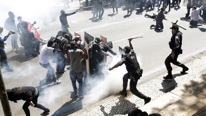 Στο Ρίο, οι συγκρούσεις με την αστυνομία εντάθηκαν στη διάρκεια της νύκτας. Διαδηλωτές, με την ομάδα αναρχικών Black Box επικεφαλής και παρά τις απαγορεύσεις των αρχών, είχαν αρχικά προσπαθήσει να διακόψουν την στρατιωτική παρέλαση, προκαλώντας σύγχυση. Η αστυνομία τους απώθησε με δακρυγόνα και ένα μέρος του πλήθους αναγκάστηκε να φύγει από την κεντρική αρτηρία της πόλης, όπου διεξαγόταν η παρέλαση. Τουλάχιστον 14 άνθρωποι τραυματίστηκαν και 80 διαδηλωτές συνελήφθησαν, σύμφωνα με τον ίδιο ενημερωτικό ιστότοπο.