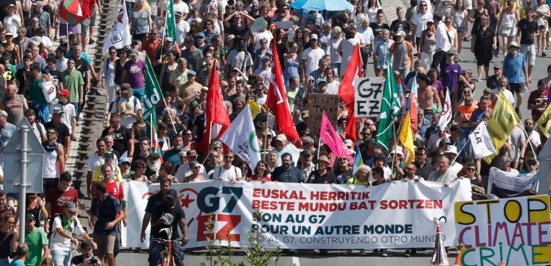 “Όχι στην G7. Για έναν καλύτερο κόσμο”, έγραφε ένα πανό. “Επικεφαλής κρατών, ο Αμαζόνιος φλέγεται”, έγραφε ένα άλλο.Οι διαδηλωτές πραγματοποίησαν πορεία από την πόλη Εντάι ως την πόλη Ιρούν της Ισπανίας, περίπου 30 χλμ νοτίως της Μπιαρίτς.Οι διαδηλωτές προέρχονταν από όλες τις περιοχές της Γαλλίας και πέραν των συνόρων της, στην περιοχή των Βάσκων αυτονομιστών.