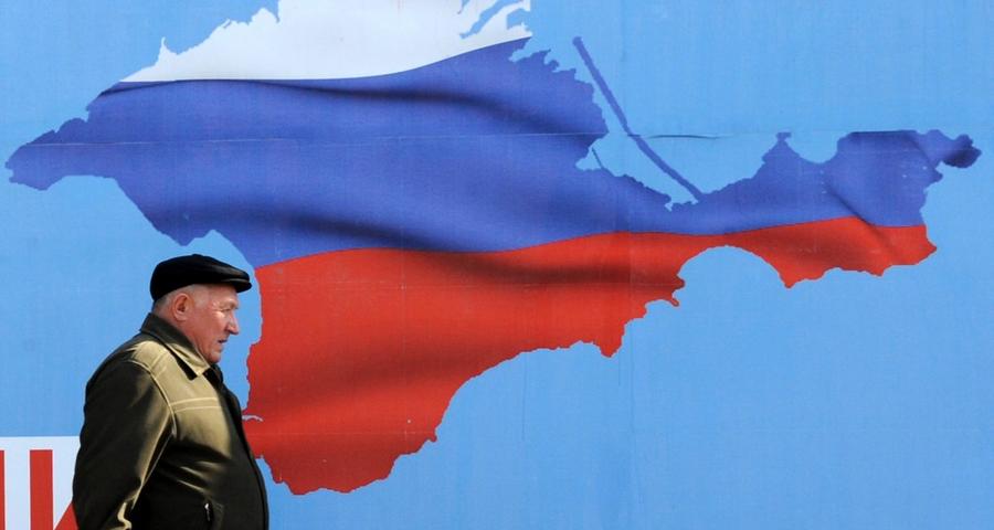 Γιγαντοαφίσα σε δρόμο της Συμφερόπολης της Κριμαίας, ενόψει του δημοψηφίσματος της Κυριακής