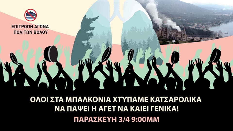 στα μπαλκόνια και στα ανοιχτά παράθυρα να χτυπήσουμε δυνατά τα κουζινικά μας για να μας ακούσει η κυβέρνηση και να σταματήσει τη λειτουργία της ΑΓΕΤ-LAFGARGEHOLCIM εν μέσω Πανδημίας.Η μείωση της βιομηχανικής δραστηριότητας, όπως ήδη συμβαίνει στην Ιταλία, θα βοηθήσει τις ευπαθείς ομάδες των συνανθρώπων μας, που υποφέρουν ιδιαίτερα από αναπνευστικά προβλήματα, όπως και τα παιδιά και όλους μας, να ανταπεξέλθουμε στην πανδημία του Κορονοϊού!