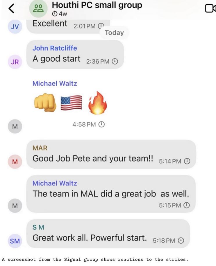 Επιπλέον, στις συνομιλίες ο σύμβουλος Εθνικής Ασφαλείας ενημέρωσε τα υπόλοιπα μέλη της ομάδας ότι η επιχείρηση κατέληξε στην εξόντωση του κορυφαίου ειδικού των Χούθι για το πυραυλικό τους οπλοστάσιο, παραδεχόμενος ότι ο στόχος βρισκόταν στο κτίριο όπου διέμενε η κοπέλα του, παρότι το Πεντάγωνο είχε ισχυριστεί δημόσια ότι κανένας άμαχος σκοτώθηκε από τα αμερικανικά πλήγματα του περασμένου Σαββάτου.