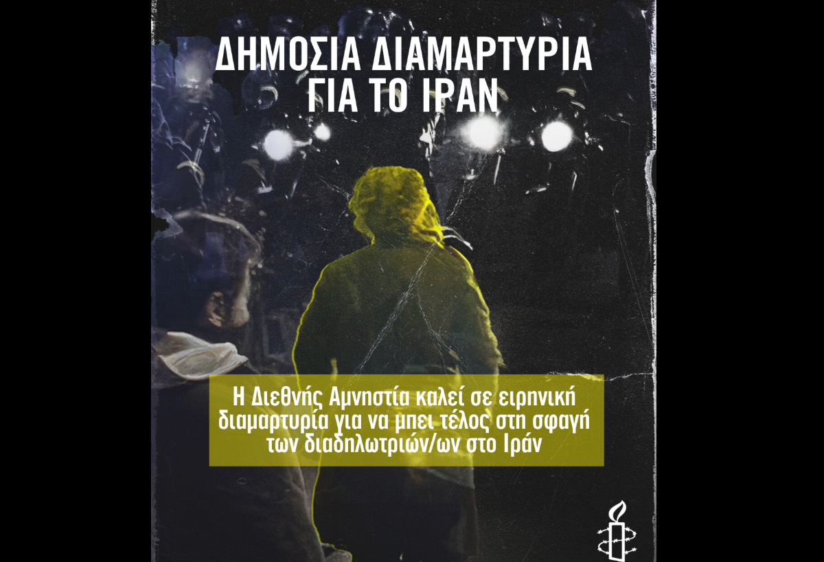 Την Παρασκευή 30 Ιανουαρίου στις 19:00 το Ελληνικό Τμήμα της Διεθνούς Αμνηστίας και οι ακτιβίστριες και οι ακτιβιστές μας θα βρισκόμαστε στην πλατεία Συντάγματος (σκαλάκια) για να διαδηλώσουμε ειρηνικά για τη σφαγή που συμβαίνει αυτή τη στιγμή στο Ιράν.