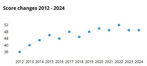 Στο παραπάνω γράφημα μπορεί κανείς να διαπιστώσει ότι το 2012 η Ελλάδα βρισκόταν σε αρκετά καλύτερη θέση στον δείκτη διαφθοράς σε σχέση με το 2023 και 2024, αν και στα χρόνια ενδιάμεσα έχουν υπάρξει αρκετά «σκαμπανεβάσματα». Βέβαια, σταθερά από το 2013 και μετά η Ελλάδα κατακτά χαμηλές θέσεις στον σημαντικό αυτό δείκτη της κατάταξης της Διεθνούς Διαφάνειας.