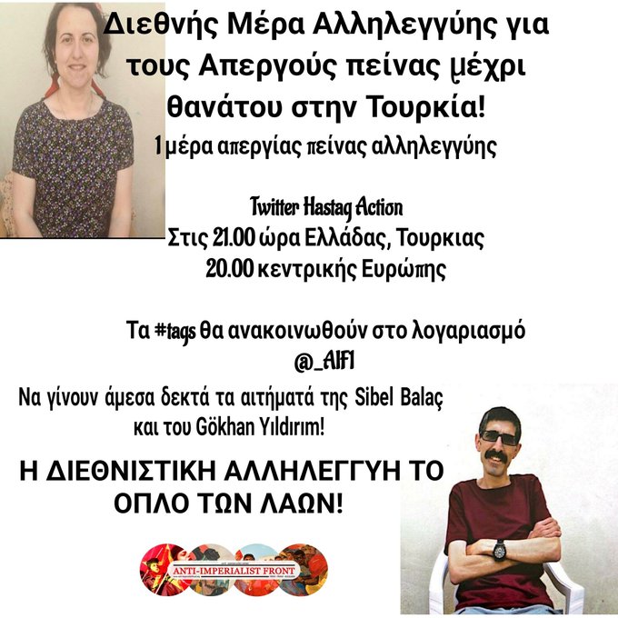 «Να ενώσουμε τη φωνή μας με τους απεργούς πείνας για δικαιοσύνη. Ο Gökhan είναι σήμερα 42 κιλά!», αναφέρει στο κάλεσμά του στο Twitter το Λαϊκό Μέτωπο (Τουρκίας).