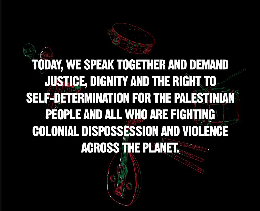 Με ανοιχτή επιστολή εκατοντάδες μεγάλοι καλλιτέχνες απ’ όλο τον κόσμο ενώνουν της φωνές τους εκφράζουν την αλληλεγγύη τους στην Παλαιστίνη. «Μιλάμε μαζί και απαιτούμε δικαιοσύνη, αξιοπρέπεια και δικαίωμα αυτοδιάθεσης για τον παλαιστινιακό λαό και όλους όσους αγωνίζονται ενάντια στην αποικιακή απαλλοτρίωση και τη βία σε ολόκληρο τον πλανήτη» σημειώνουν.