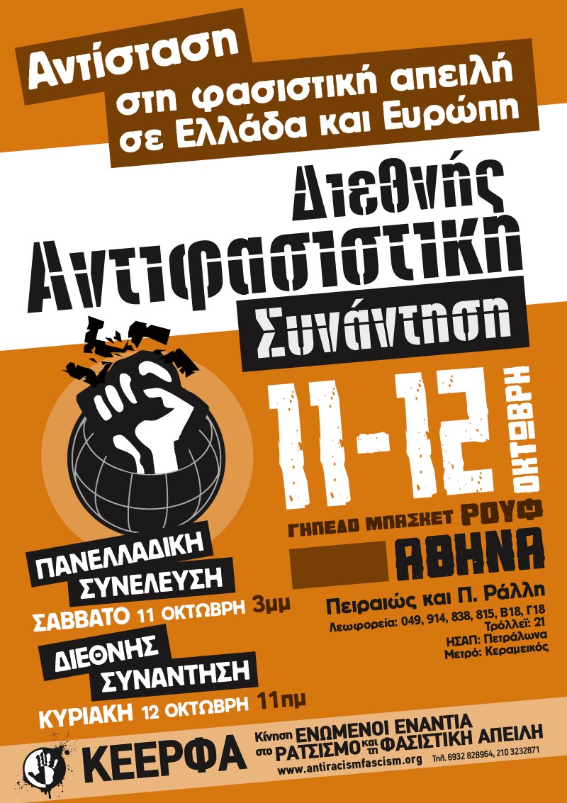 Η Πανελλαδική Αντιφασιστική Συνάντηση και η Διεθνής Συνάντηση κατά του φασισμού και του ρατσισμού στις 11 και 12 Οκτώβρη, αμέσως μετά τις κινητοποιήσεις στον ένα χρόνο από τη δολοφονία του Παύλου Φύσσα, θα δώσει συνέχεια στην δράση του αντιφασιστικού και του αντιρατσιστικού κινήματος που βρίσκεται μπροστά στη μεγάλη πρόκληση της δίκης των νεοναζί της Χρυσής Αυγής. Θα τιμωρηθούν επιτέλους οι δολοφόνοι του Παύλου Φύσσα και θα αρχίσει το ξήλωμα της ναζιστική συμμορίας ή θα καταφέρει να διασωθεί με τις πλάτες των Μπαλτάκων της ΝΔ και των επιχειρηματιών που την στηρίζουν;
