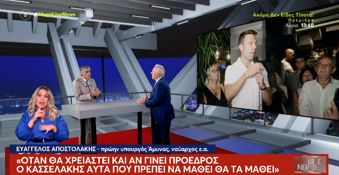 Στην συνέχεια ο Ευάγγελος Αποστολάκης μιλώντας για τον Στέφανο Κασσελάκη είπε ότι είναι ένας άνθρωπος που μαθαίνει γρήγορα κι αν γίνει πρόεδρος της αξιωματικής αντιπολίτευσης αυτά που θα πρέπει να γνωρίζει θα τα μάθει. «Νομίζω όμως ότι είναι άδικο σε αυτή την στιγμή να κάνουμε κόντρα γνώσεων. Γενικά όλοι ξέρουμε τα θέματα γύρω από τα ελληνοτουρκικά, γιατί παρακολουθούμε τις ειδήσεις».