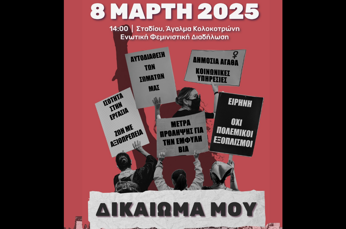 Με κεντρικό σύνθημα το “Δικαίωμά μου”, την 8η Μάρτη 2025 θέλουμε να βρεθούμε ενωμένες μαζικά στο δρόμο, υπερασπιζόμενες το δικαίωμά μας σε μία αξιοβίωτη ζωή για όλες μας.