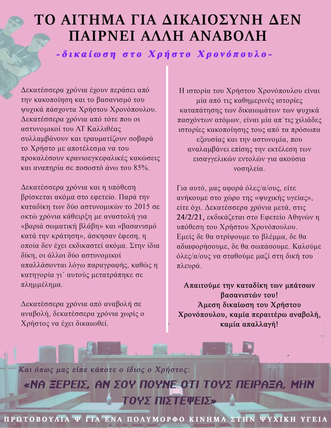 Με αφορμή το παραπάνω, η Πρωτοβουλία Για Ένα Πολύμορφο Κίνημα Στην Ψυχική Υγεία απευθύνει έκκληση στον κόσμο να σταθεί δίπλα και να στηρίξει τον Χρήστο Χρονόπουλο.