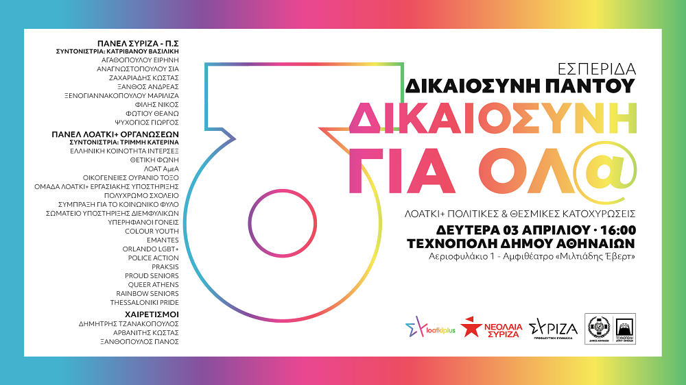 «Τα προηγούμενα χρόνια οι διεκδικήσεις της ΛΟΑΤΚΙ+ κοινότητας έφεραν κάποια αποτελέσματα, αλλά τα ΛΟΑΤΚΙ+ άτομα εξακολουθούν να είναι πολίτες δεύτερης κατηγορίας καθώς νομικά κενά αλλά και θεσμοθετημένη λοατκιφοβία έχουν εδραιώσει κανόνες και πρακτικές σε όλα τα πεδία – στην Δικαιοσύνη, την Υγεία, την Εκπαίδευση, την Εργασία, την Κοινωνική Πρόνοια κ.ο.κ. που έχουν τις ρίζες τους σε συγκεκριμένα ιστορικά πρότυπα αποκλεισμού και περιθωριοποίησης. Ήρθε η ώρα για μια ολοκληρωμένη και ολιστική στρατηγική διεκδικήσεων και η πρόταση της ΛΟΑΤΚΙ+ ομάδας του ΣΥΡΙΖΑ-ΠΣ αντιμετωπίζει την πρόκληση της ανάδειξης εκείνων των πολιτικών που θα εξασφαλίσουν “Δικαιοσύνη Παντού – Δικαιοσύνη για Όλα”», τονίζεται στο κάλεσμα της εκδήλωσης.