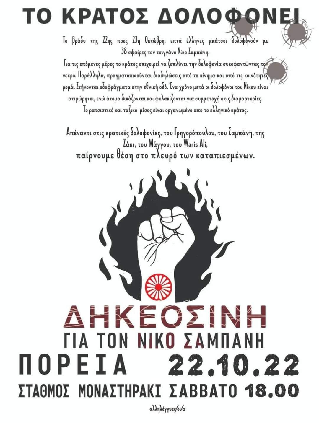 «Απέναντι στις κρατικές δολοφονίες του Γρηγορόπουλου, του Σαμπάνη, της Ζάκι, του Μάγγου, του Waris Ali παίρνουμε θέση στο πλευρό των καταπιεσμένων», όπως αναφέρεται χαρακτηριστικά στο κάλεσμα της πορείας.
