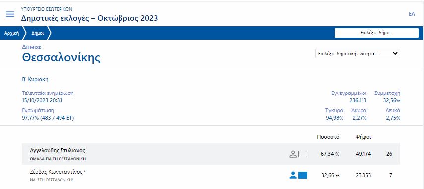 Τα ηνία του Δήμου Θεσσαλονίκης αναλαμβάνει ο Στέλιος Αγγελούδης, καθώς στο 97,77% της ενσωμάτωσης προηγείται του Κωνσταντίνου Ζέρβα με ποσοστό 67,34%, έναντι 32,66% του τελευταίου.