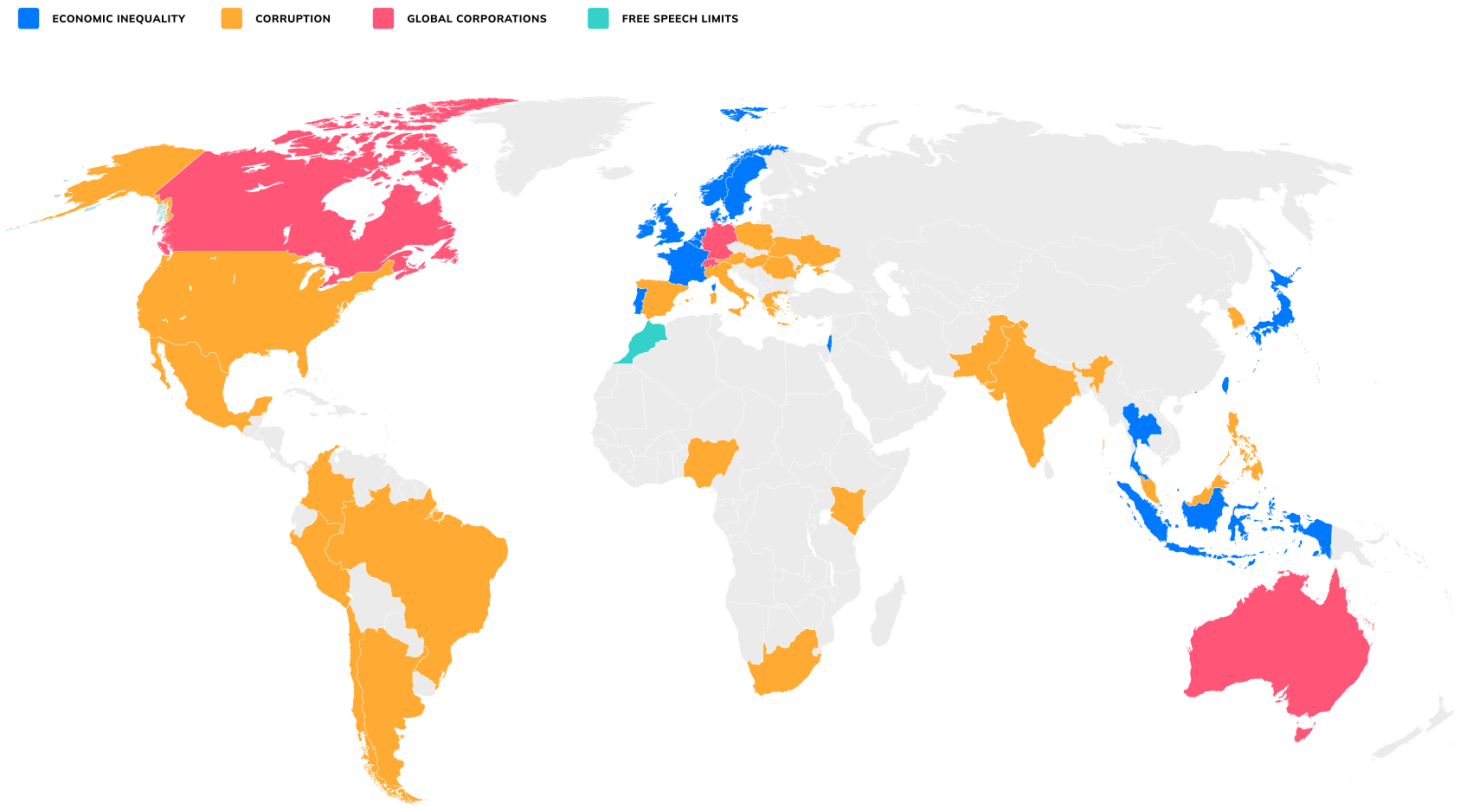 Σχετικά με τις απειλές για τη δημοκρατία, την πρώτη θέση καταλαμβάνει η ανισότητα (οικονομική και κοινωνική, 68%) και ακολουθούν η διαφθορά (67%), οι πολυεθνικές επιχειρήσεις (60%), οι περιορισμοί στην ελευθερία του λόγου (56%) και οι εκλογικές νοθείες (53%). Μάλιστα στην Ελλάδα, η αύξηση της ανισότητας θεωρείται ως η μεγαλύτερη απειλή για τη δημοκρατία (πάνω από 80%) ενώ η χώρα μας είναι πέμπτη στην κόσμο όσον αφορά στην αντίληψη της διαφθοράς ως απειλή, επίσης πέμπτη σχετικά με τη δράση των πολυεθνικών και 12η σχετικά με την ελευθερία του λόγου.