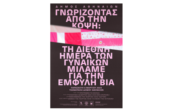 Ομιλήτριες: Γεωργία Λαλέ, εικαστικός, Μαρία Αποστολάκη, δικηγόρος συντονίστρια Νομικής Υπηρεσίας, Κέντρο Διοτίμα, Μαρία Στρατηγάκη, Αντιδήμαρχος Κοινωνικής Αλληλεγγύης και Ισότητας, Μαίρη Λεοντσίνη, Καθηγήτρια ΤΕΑΠΗ – ΕΚΠΑ, Πρόεδρος της Επιτροπής Ισότητας των Φύλων και Καταπολέμησης των Διακρίσεων – ΕΚΠΑ. Συντονίζει ο Κωστής Παπαϊωάννου, Πρόεδρος Δ.Σ. Τεχνόπολης Δήμου Αθηναίων, πρ. Πρόεδρος της Εθνικής Επιτροπής για τα Δικαιώματα του Ανθρώπου. Την εκδήλωση προλογίζει ο Δήμαρχος Αθηναίων, Χάρης Δούκας.