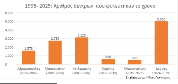 Επί της Δημαρχίας Κακλαμάνη (2007-2010) φυτεύτηκαν 12.500 δέντρα, δηλαδή 3.125 δένδρα τον χρόνο.