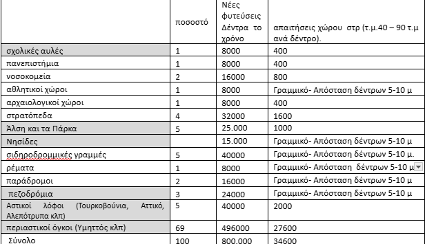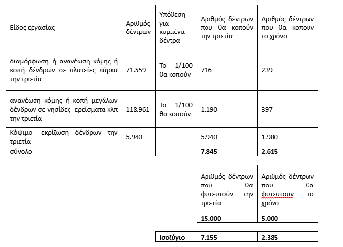 Ο αριθμός των δέντρων που θα φυτευτούν την τριετία είναι 15.000 δέντρα και τον χρόνο 5.000. Το ισοζύγιο κομμένων δέντρων με φυτεμένα δέντρα είναι 7.155 δέντρα την τριετία και 2.385 δέντρα τον χρόνο.