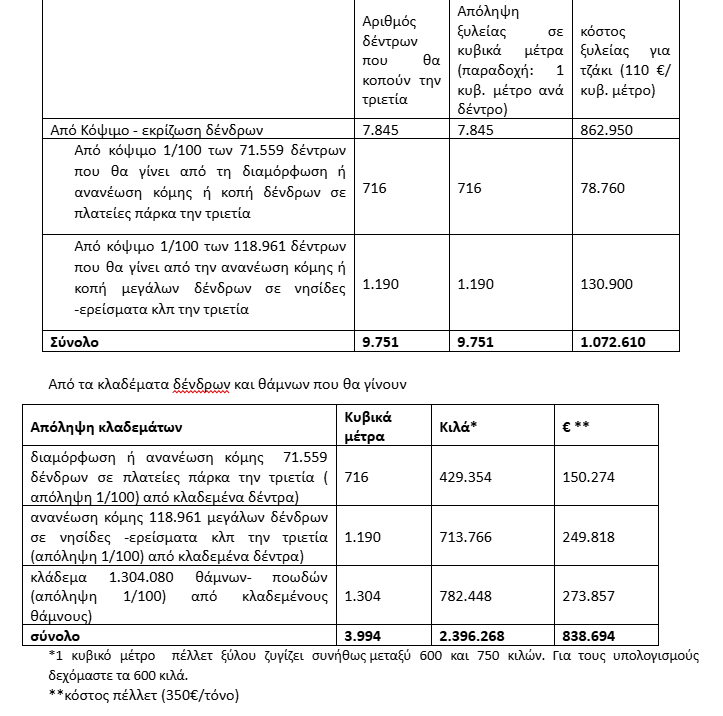 Διαπιστώνουμε ότι σε αξία τόσο οι κορμοί δέντρων όσο και τα κλαδέματα που θα αποληφθούν είναι υπολογίσιμα και είναι στο ύψος των 2.000.000 €. Αυτά θα πρέπει να είναι αντικείμενα διαπραγμάτευσης μεταξύ του Δήμου και του εργολάβου του συμφωνητικού.
