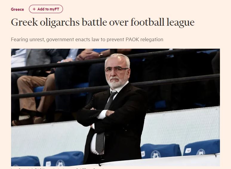 Με αφορμή τις εξελίξεις στον χώρο του ποδοσφαίρου και την τροπολογία που κατέθεσε η κυβέρνηση δημοσίευμα των FT σχολιάζει το προφίλ του Σαββίδη και του Μαρινάκη, ενώ σχολιάζει τη στάση που κρατά η κυβέρνηση ως απροθυμία να προκαλέσει τους ολιγάρχες.