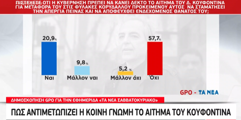 Ενώ φαίνεται να έγινε και ερώτηση σχετικά με το αίτημα του Δ.Κουφοντίνα, χωρίς και πάλι καμία αναφορά στην πρόβλεψη του νόμου αλλά αυτήν τη φορά με αναφορά σε ενδεχόμενο θάνατό του, με το ναι και το όχι να εμφανίζονται ίσα.