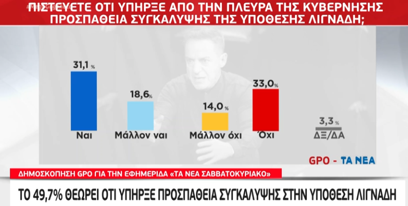 Στο θέμα της υπόθεσης Λιγνάδη για παράδειγμα, το 33% που εμφανίζεται να πιστεύει ότι δεν υπήρξε συγκάλυψη εμφανίζεται μεγαλύτερο από το 31,1% που φέρεται να πιστεύει ότι υπήρξε.