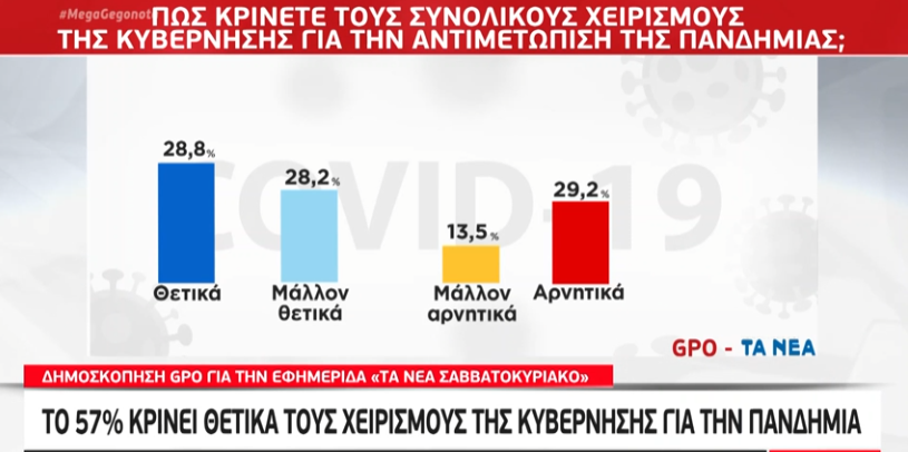Μία από τις πολλές δημοσκοπήσεις που κυκλοφορούν, αυτή της GPO για το Βήμα που παρουσιάστηκε στο Mega προκαλεί έντονες αντιδράσεις στα κοινωνικά δίκτυα, καθώς εμφανίζει το 29,2% των πολιτών που κρίνουν αρνητικά την κυβέρνηση στη διαχείριση της πανδημίας να είναι μικρότερο από το 28,8% που την κρίνει θετικά.