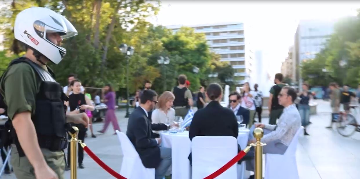«Ως μέλη του δικτύου Support Earth, των Άγρυπνων πολιτών, αλλά και ως ανεξάρτητοι πολίτες και καλλιτέχνες, κάναμε μία καλλιτεχνική παρέμβαση ζητώντας από τους “επενδυτές” να κατέβουν από τα σαλόνια των λουσάτων ξενοδοχείων για να δειπνήσουν στην κεντρικότερη πλατεία της πόλης που ανήκει σε όλες και όλους. Μπροστά στα μάτια μας αλλά πίσω από τις ειδικές δυνάμεις της Τάξης… τους, αποφάσισαν να μας στερήσουν τον αέρα με ιδιωτικοποίηση του νερού, δημοπρασίες των βουνοκορφών και των αιγιαλών, και πολλές ΒΑΠΕ, πετρέλαια και φυσικό αέριο. Η παρέμβασή μας ολοκληρώθηκε λίγο πιο σύντομα από ότι υπολογίζαμε αφού ενημερωθήκαμε από τις επίσημες αστυνομικές δυνάμεις ότι η παρουσία μας εκεί απαιτεί ειδική άδεια. Φαίνεται πως το δικαίωμα στην ελεύθερη έκφραση χρήζει ειδικής άδειας. Προς στιγμήν, νομίζαμε ότι επιστρέψαμε στην καραντίνα και στην απαγόρευση κυκλοφορίας. Κι όμως, απλά έχουμε επιστρέψει στην κανονικότητα.»
