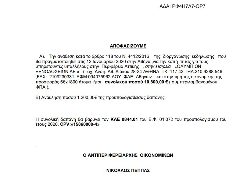 Την πρωτοχρονιάτικη πίτα της έκοψε η Περιφέρεια Αττικής στις 12 Ιανουαρίου, με την δαπάνη που ενέκρινε η οικονομική της επιτροπή να φτάνει τα 12.000 ευρώ, ακριβώς όσα είχε εγκρίνει προ ημερών και το υπουργείο Αγροτικής Ανάπτυξης, του Μάκη Βορίδη. Μάλιστα, σε νεότερη απόφαση της περιφέρειας, αποφασίστηκε η ανάκληση ποσού 1.200 ευρώ, με τη σημείωση πως το κόστος κατά άτομο ανήλθε τελικά στα 6 ευρώ σε σύνολο 1.800 ατόμων.