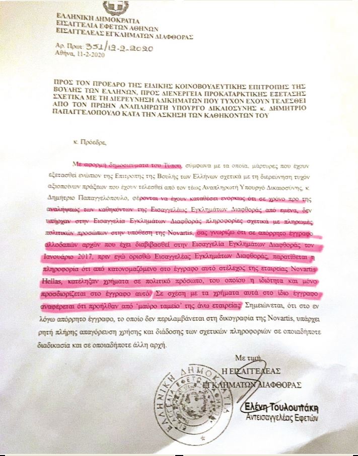 Σύμφωνα με πληροφορίες που αποκάλυψε η εφημερίδα «Δημοκρατία», την περασμένη Τρίτη, η εισαγγελέας κατά της Διαφθοράς, Ελένη Τουλουπάκη, ενημέρωση μέσω επιστολής της τον πρόεδρο της προανακριτικής επιτροπή, Γιάννη Μπουγά, πως από το 2017, στα χέρια της Εισαγγελίας βρίσκεται «απόρρητο έγγραφο αλλοδαπών Αρχών», το οποίο αναφέρει ευθαρσώς πως στέλεχος της Novartis δωροδόκησε πολιτικό πρόσωπο. Υπενθυμίζεται πως έχουν ήδη ασκηθεί διώξεις σε βάρος του Ανδρέα Λοβέρδου για το αδίκημα της παθητικής δωροδοκίας, ενώ ανοιχτές παραμένουν οι υποθέσεις που εξετάζει η Δικαιοσύνη για τον Άδωνι Γεωργιάδη και τον Δημήτρη Αβραμόπουλο.