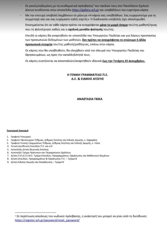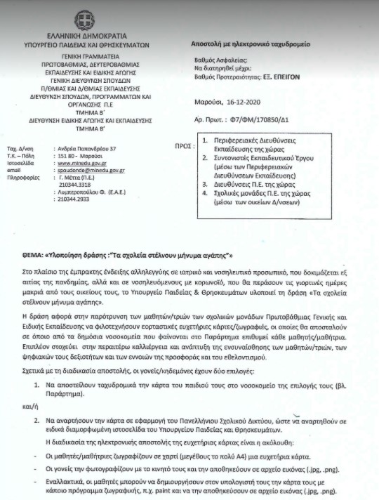 Στην εγκύκλιο, το υπουργείο κάνει σχεδόν προκλητικά λόγο για την υλοποίηση μίας δράσης «στο πλαίσιο της έμπρακτης ένδειξης αλληλεγγύης σε ιατρικό και νοσηλευτικό προσωπικό, που δοκιμάζεται εξ αιτίας της πανδημίας, και σε νοσηλευόμενους με κορονοϊό», ζητώντας από τους γονείς να αποστείλουν τις εορταστικές ευχετήριες κάρτες ή ζωγραφιές των μαθητών και των μαθητριών σε ένα νοσοκομείο που θα επιλέξουν.