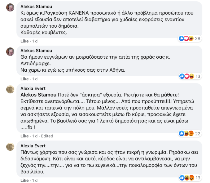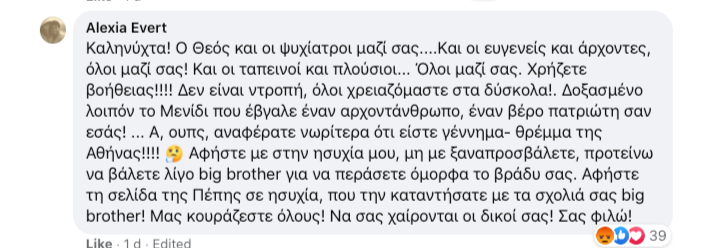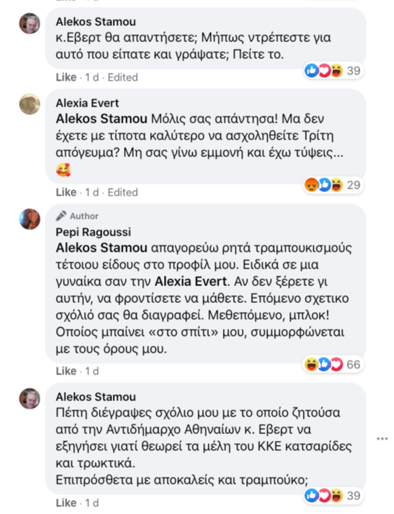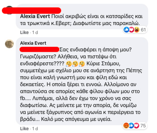 Πάντως, μην αφήνοντας περιθώρια παρανόησης για τον τόνο των απαντήσεών της, η ίδια εξακολούθησε την αντιπαράθεση κάτω από την επίμαχη ανάρτηση, με τα screenshot που αναδημοσίευσε στα κοινωνικά δίκτυα ο δημοσιογράφος Γιάννης Μπαμπούλιας να είναι ενδεικτικά του ύφους της, παρότι ένας χρήστης: